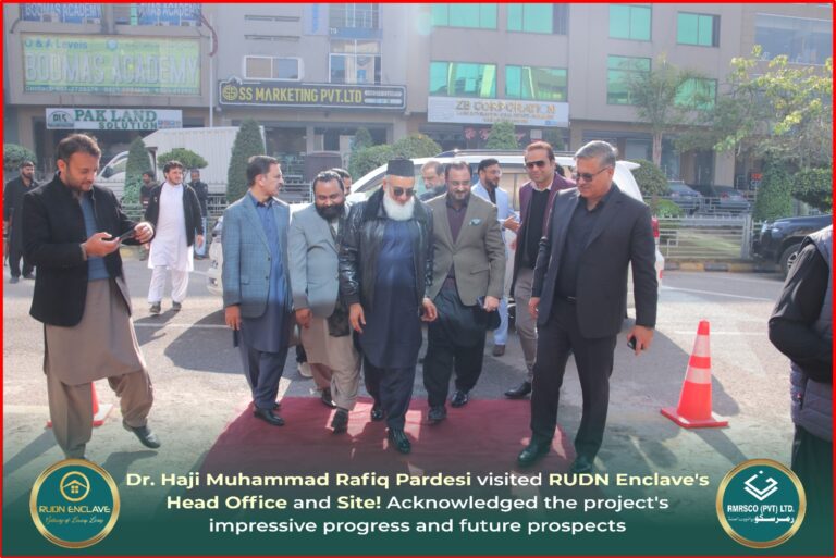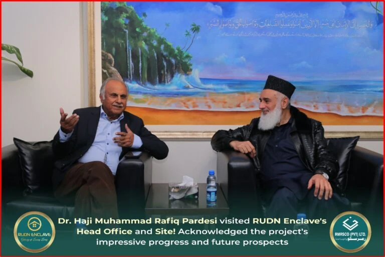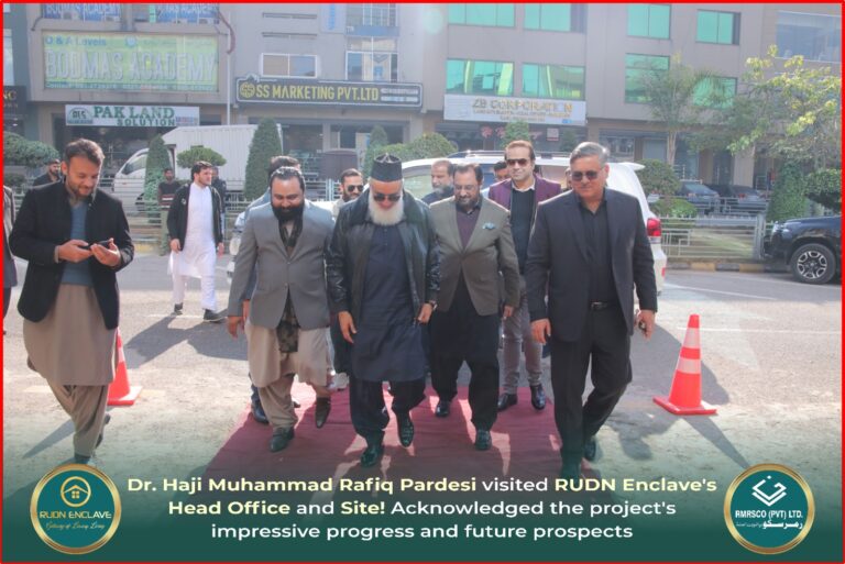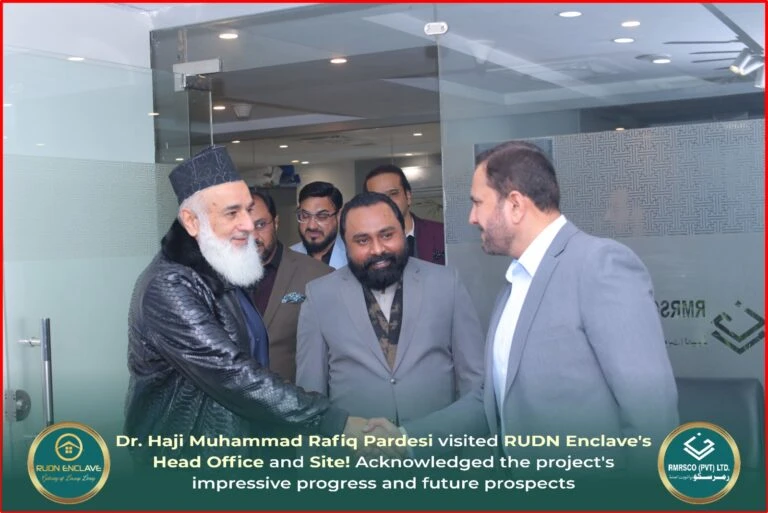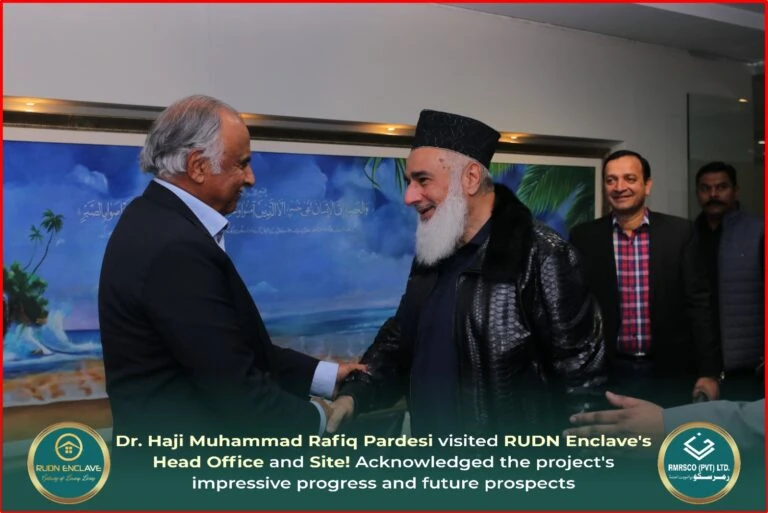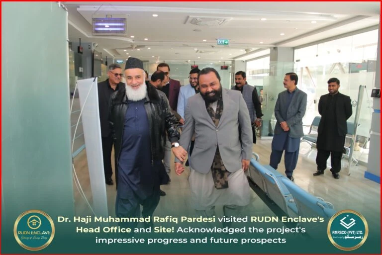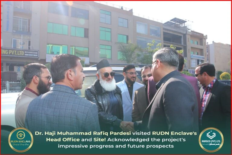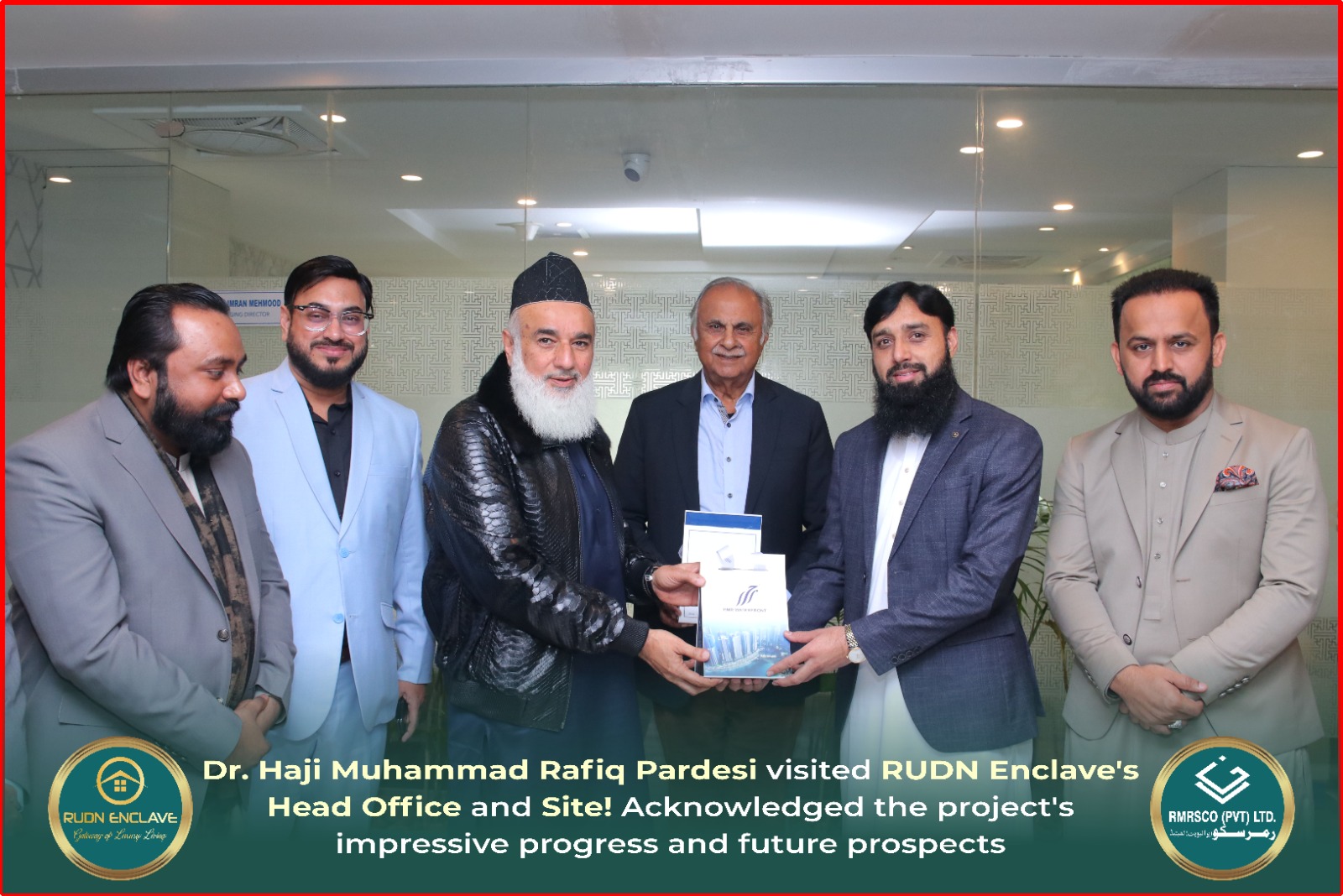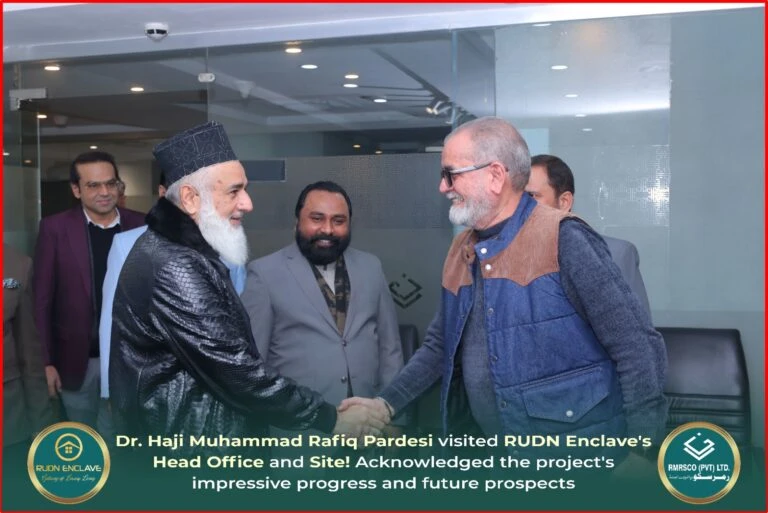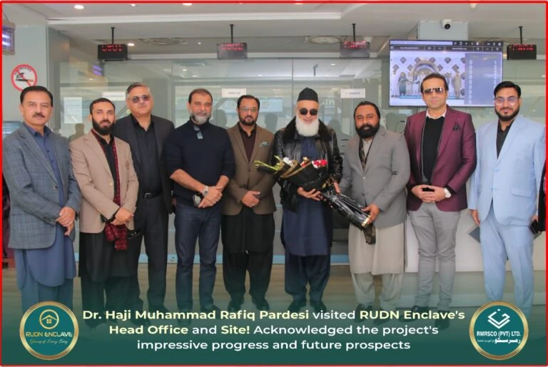 Dr. Haji Muhammad Rafiq Pardesi, a renowned philanthropist and business magnate, recently visited the Rudn Enclave office, marking a momentous occasion for the project. He was warmly received by the distinguished leadership team, including Malik Asad Abbas, the Country Head; Lt. General Abdul Qayyum (Rtd.), the Patron-in-Chief; Usman Qureshi, the Director of Land; and Raheem ud Din, the CEO of RUDN Enclave. The team extended their gracious hospitality, offering Dr. Pardesi a comprehensive briefing on the project’s visionary development plans, which feature cutting-edge infrastructure, sustainable design, and a prime strategic location. Dr. Pardesi expressed his admiration for the meticulous planning and forward-thinking vision of Rudn Enclave, commending the team’s efforts to create a world-class residential and commercial community. His valuable insights and words of encouragement inspired the management and reinforced their commitment to delivering excellence. The visit symbolized not only Dr. Pardesi’s support for innovative and community-driven initiatives but also Rudn Enclave’s dedication to fostering economic growth and societal progress.